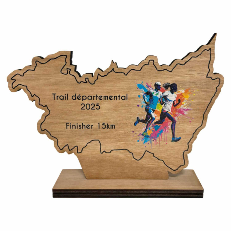 Trophée création en Bois modèle département. Matière : Bois (Contre Plaqué) - plusieurs tailles disponibles épaisseur 10mm - personnalisable en gravure laser noir ou impression couleurs par encres UV : gravure/impression et texte au choix, le texte et le logo standard sont compris dans le prix du trophée. Prix affiché TTC.