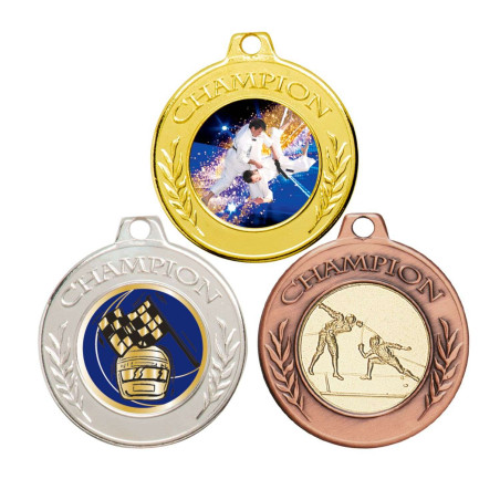 Médaille champion multisports avec pastille. Matière : métal - diamètre 40mm - coloris : or, argent, bronze - pastille diamètre 25mm, discipline au choix. Prix affiché TTC