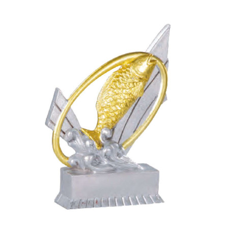 Trophée résine poisson. Coloris : argent et or - matière : résine - Hauteur 12cm. Prix affiché TTC.